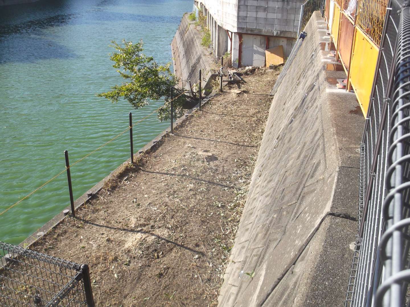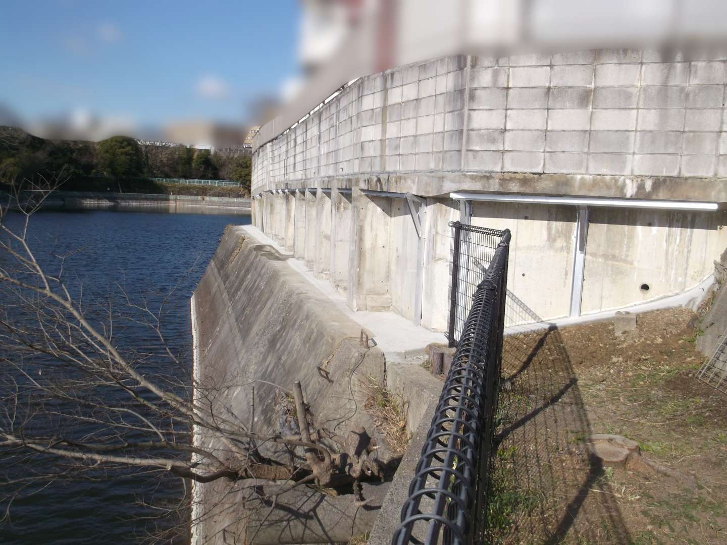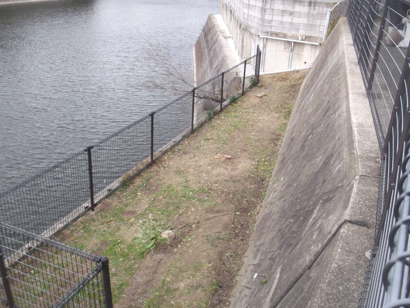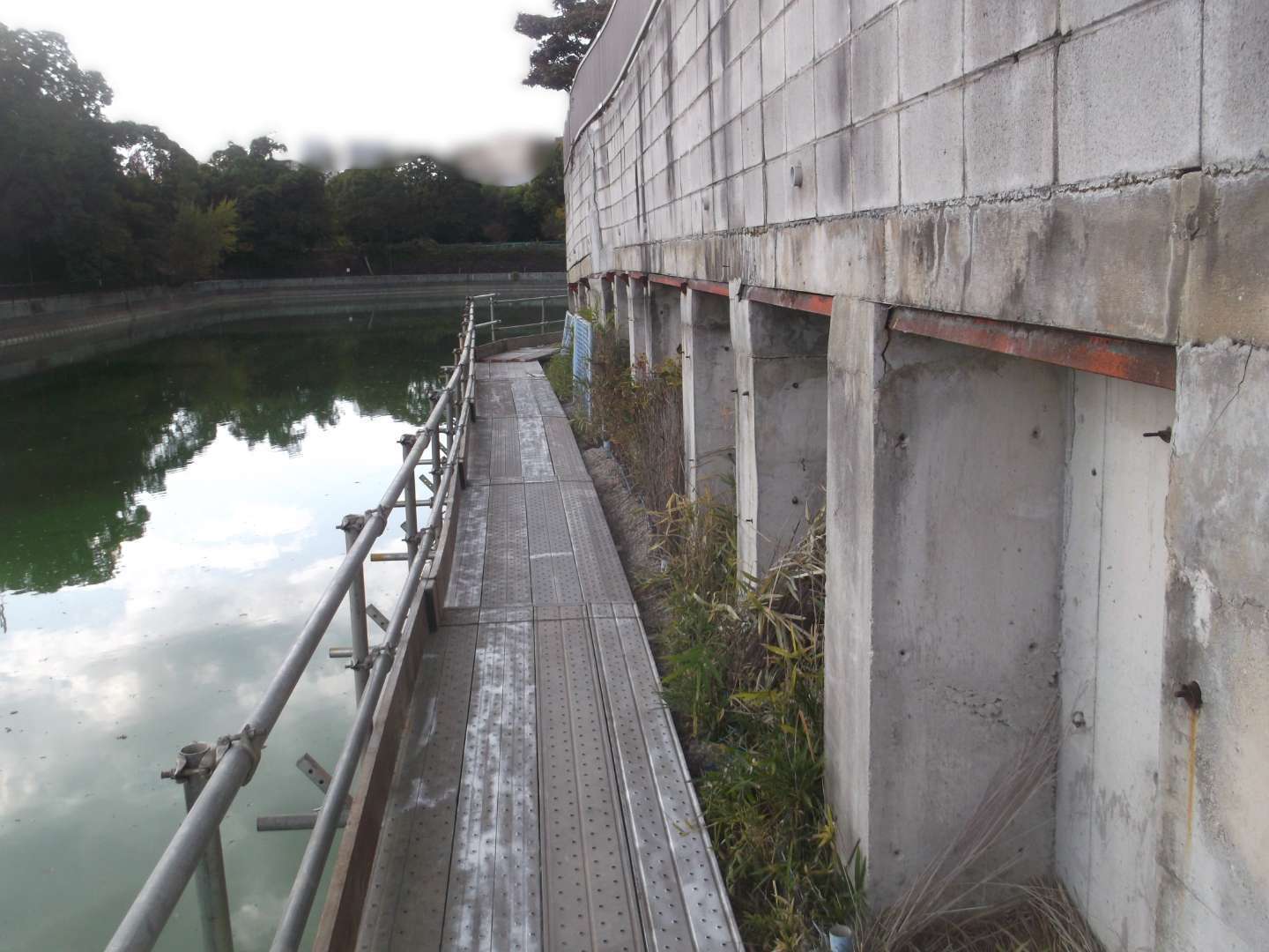 貯水池側の堤体は、波や水位変動による浸食を防ぐために、コンクリートブロックなどで保護するのですが、鉄骨を入れて補強する事により、より安全な堤になっています。