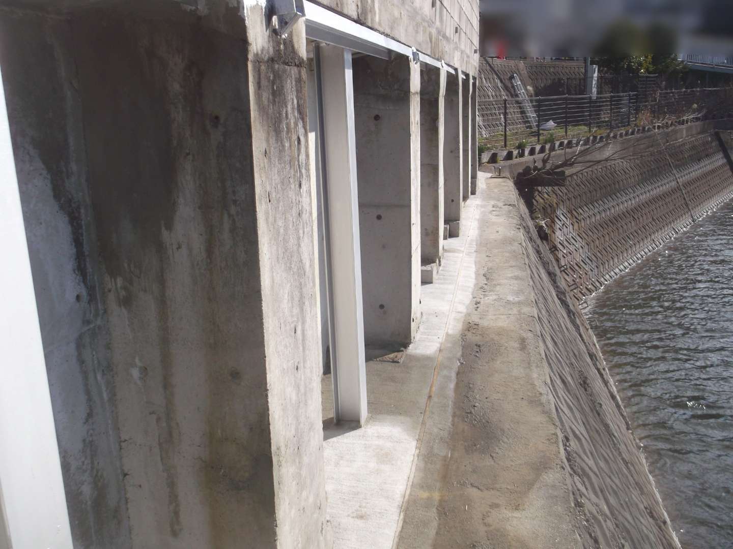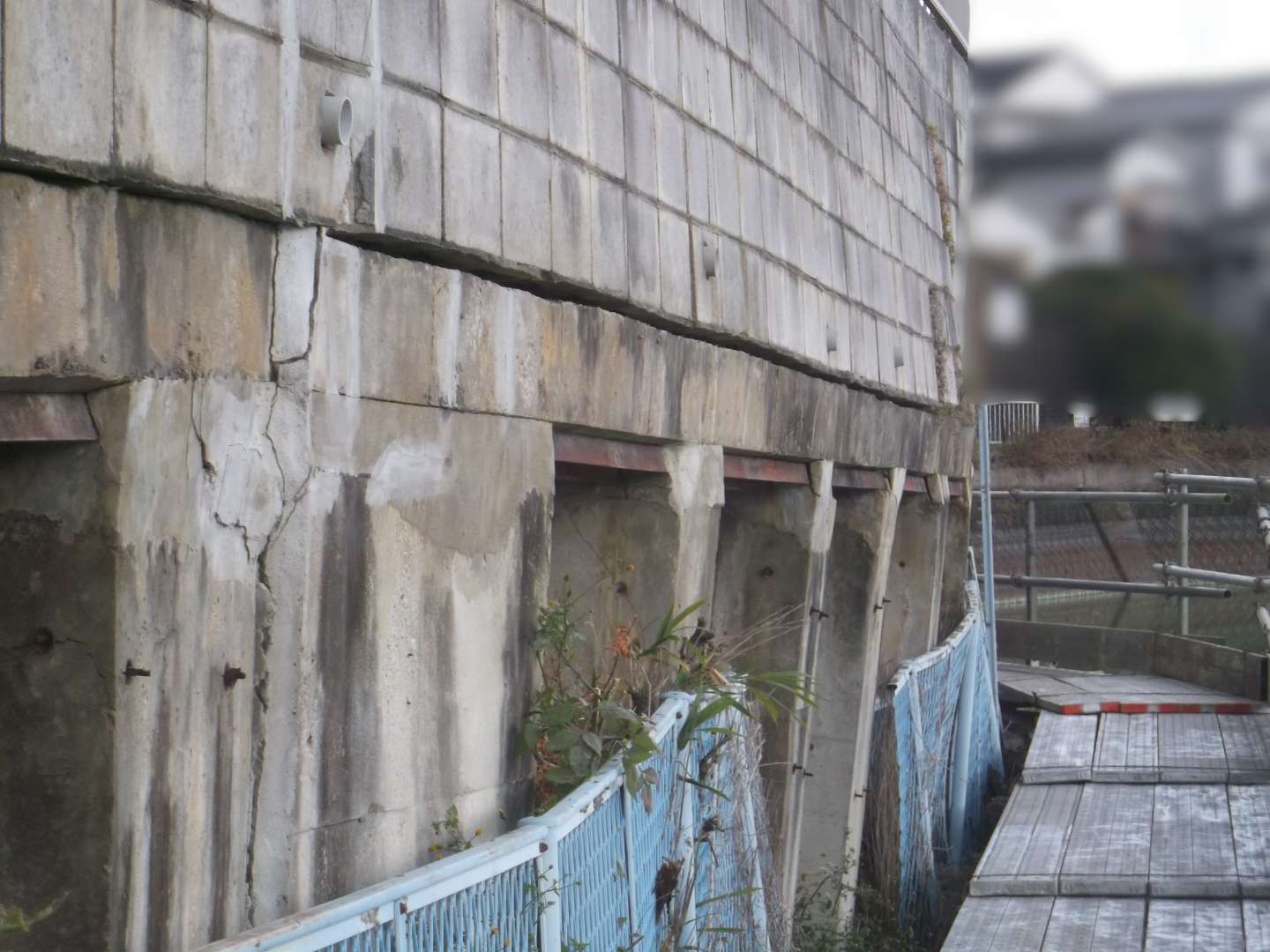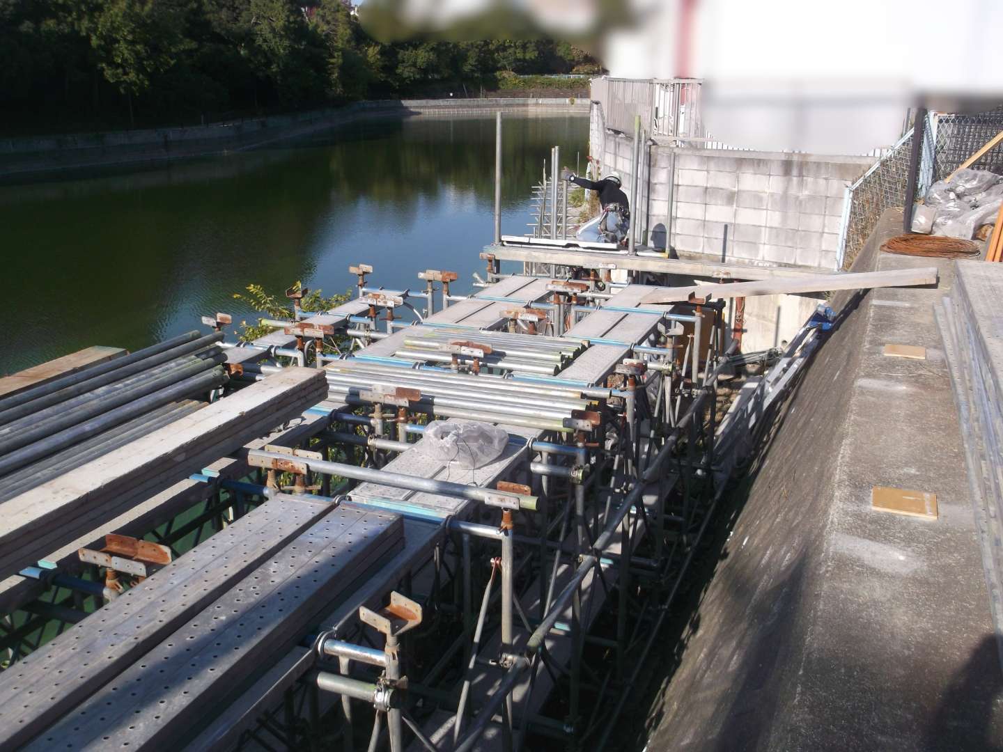 貯水池側の堤体は、波や水位変動による浸食を防ぐために、コンクリートブロックなどで保護するのですが、鉄骨を入れて補強する事により、より安全な堤になっています。